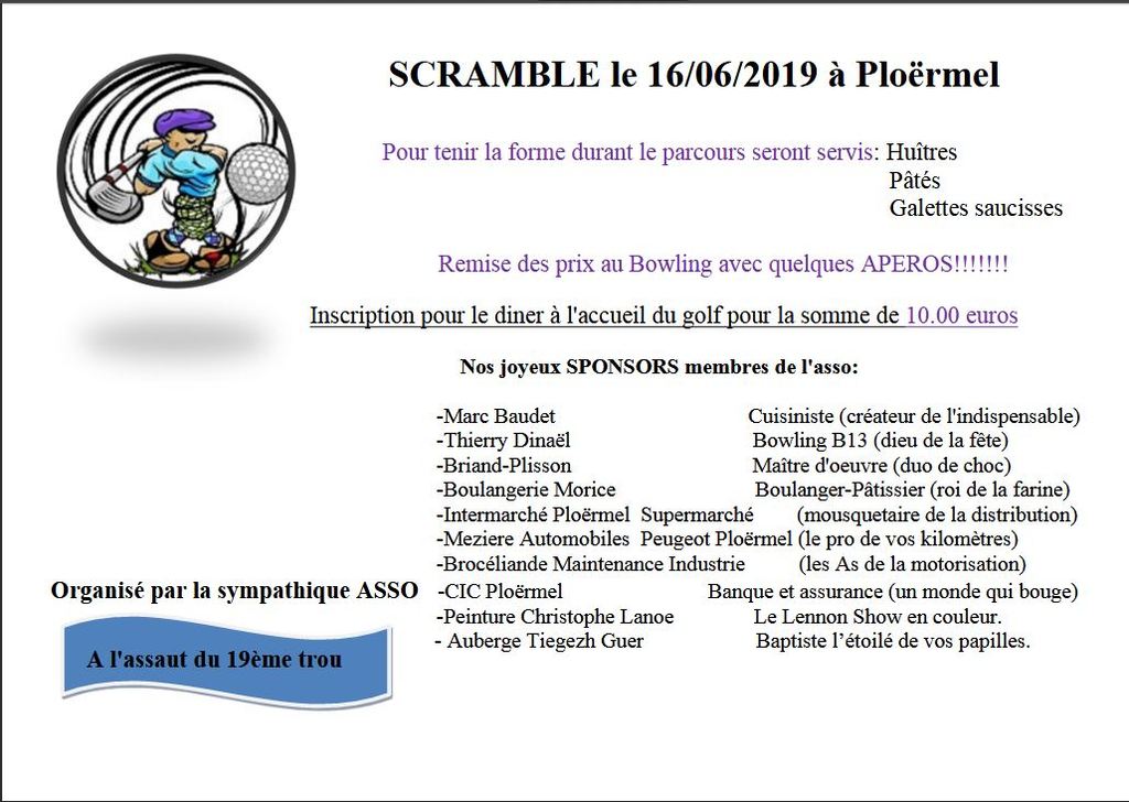 Ils renouvellent l'expérience!! Ce groupe d'amis, chefs d'entreprise et golfeurs pour certains, réunis dans l'association "A l'assaut du 19eme trou", nous invitent à participer au scramble organisé le 17 juin, avec deux départs en shot-gun.